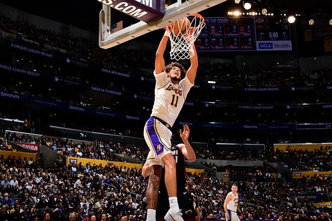 本场比赛中,顶替受伤的德安德烈-艾顿(DeAndre Ayton)作为球队先发中锋的贾克森-海斯(Jaxson Hayes)的表现算得上是相当不错。海斯全场出场32分24秒,投篮7中7,三分线外1中1,以100%的命中率拿下了15分5篮板1助攻1抢断1盖帽的数据,还有1次失误和3次犯规,正负值也是达到了全场最高的+17。海斯在进攻端简直是大杀四方,他展现出了相当不错的篮下得分能力和终结能力,他甚至还命中了一记三分,这也是他加盟湖人以来为球队命中了首记三分,这样的表现也是远远超出大家预期的。不仅如此,海斯在防守端也是起到了很好的效果,他也是帮助球队镇守住了内线。事实上,海斯在比赛第一节就直接拿到了11分,这也帮助球队建立起了领先优势,他也为球队的这场胜利做出了不小的贡献。